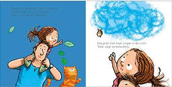 Mark Jannsen verbeeldt op zijn beurt het grappige verhaal van Valerie op een vlotte toepasselijke manier. Je ziet de frustratie van Ella, ze zal en móet bij die wolk komen. Geweldig is de afbeelding van Ella die triomfantelijk rondbanjert op haar moeders, veel te grote, hoge hakken. De dikke rode poes loopt er net zo parmantig achteraan.