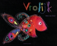 Het deed me aanvankelijk een beetje vreemd aan. Een gitzwart boek met een heel mooie, glimmende, rood-roze vis op de voorkant, daarboven staat in kinderhandschrift het woord vrolijk. Zou het juist een niet vrolijke inhoud hebben, gezien die zwarte cover? Maar, dacht ik, die prachtige vis kijkt wél heel erg vrolijk.